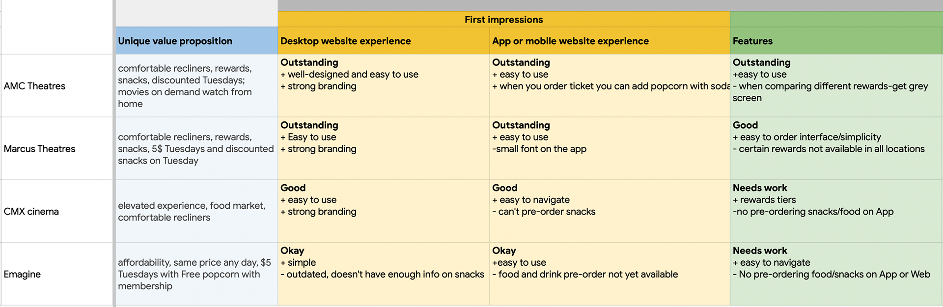 With the user accessibility in mind, I wanted to make sure that users reach the checkout screen without any hiccups. So, I created this user journey map, to identify opportunities for improvement. I was able to identify that a user needs to select the right location for the movie theater, so it could connect the user to the right selection of snacks available at this particular location, as well as specify the time it should be ready for user to pick up.